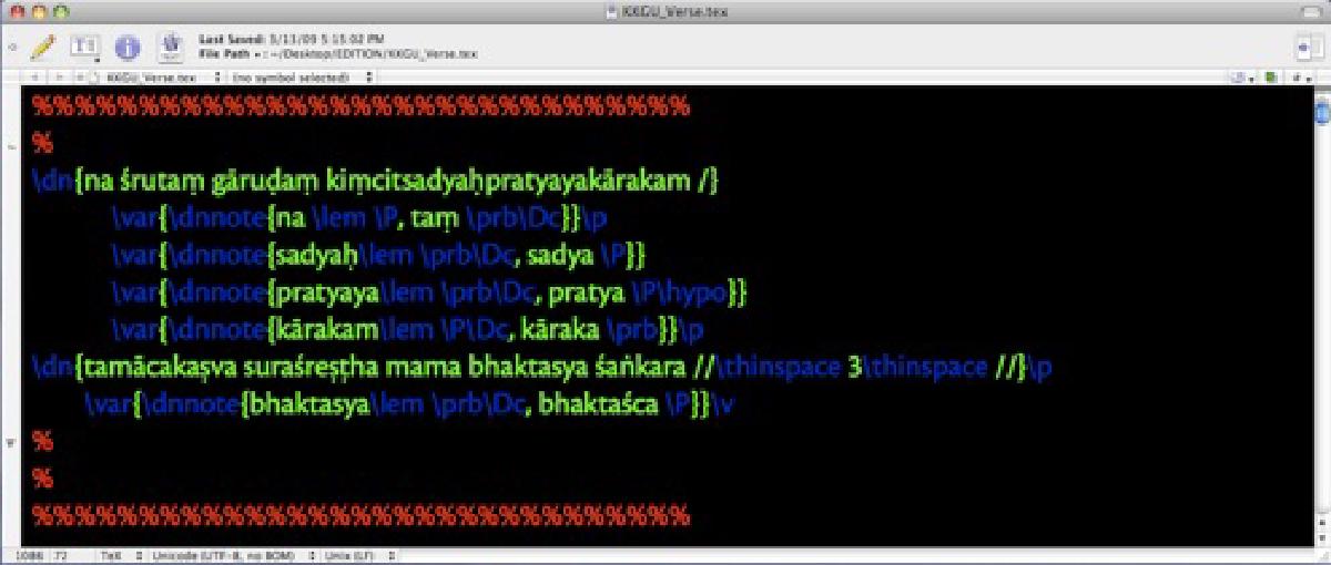 For my editing work, I am using XeTeX and ledmac, typeset in TeXshop on my Mac. XeTeX is a modern incarnation of LaTeX, itself building on TeX, that lets one type virtually any unicode script or font directly into the source file. With the help of Somadeva Vasudeva’s handy character mapping converter, one has the advantage of typing transliterated Sanskrit into the source file and still having perfectly rendered devanāgarī on the other end. I include the above screenshots lightheartedly, but they illustrate an important point: LaTeX may seem hopelessly complicated in the beginning, but it really isn’t; one just needs to master the basic principles. Eventually, sooner if anyone is interested, I will post a full sample file that beginners can use as a template to typeset their own texts. I have spoken with colleagues who type their critical apparatuses by hand in Microsoft Word. The beautiful thing about TeX systems is that they automate almost everything so that the writer can concentrate on writing, or in this case editing. In the top example, you can see that variant readings are called by the command \var{}. The command \dn{} is how I tell the program to typeset the enclosed text in devanāgarī (\dnnote{} signaling the footnote sized font), and the commands \P, \prb, and \Dc are telling the program to print my predefined sigla for each manuscript. This is all automated with keyboard shortcuts, so when I have a variant I copy the word(s) from the main text and paste it into the variant field called up at a moment’s notice with a quick shortcut stroke. The command \p (lowercase mind you) stands for the end of a pāda, and \v for the end of the verse. This is all the program needs to label each variant entry with the correct tag: 3c if the variant occurs in the third pāda of the third verse, and so on. Everything in TeX is customizable, but it does get technical very quickly and I must admit that I do very little experimenting now that I have figured out the basic system. Perhaps in a few more years I’ll be enough of a TeXpert to write my own fancy code and create that long sought after parallel edition, but now I am content to pick up the small gems offered by more experienced scholars: